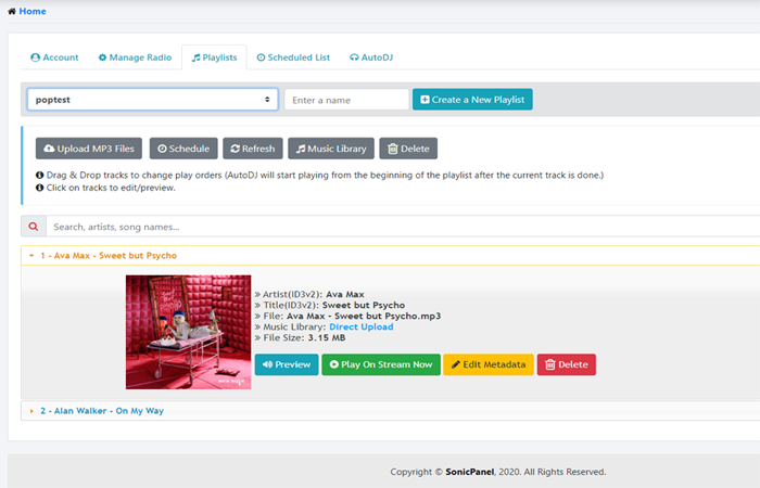 Clientes SP tiene el administrador de listas de reproducción más avanzado y es fácil de usar. Su cliente puede simplemente arrastrar y soltar pistas para cambiar el orden de reproducción de una lista de reproducción, sistema de carga MP3 de arrastrar y soltar a través del navegador, 100 veces más rápido y fragmentado. Edición de metadatos de las pistas completamente ID3V2 y reproducción de una pista inmediatamente en la radio, búsqueda de pistas sin carga. Todas las funciones están en el administrador de listas de reproducción sin dejar de escuchar y sin interrupciones en la radio.